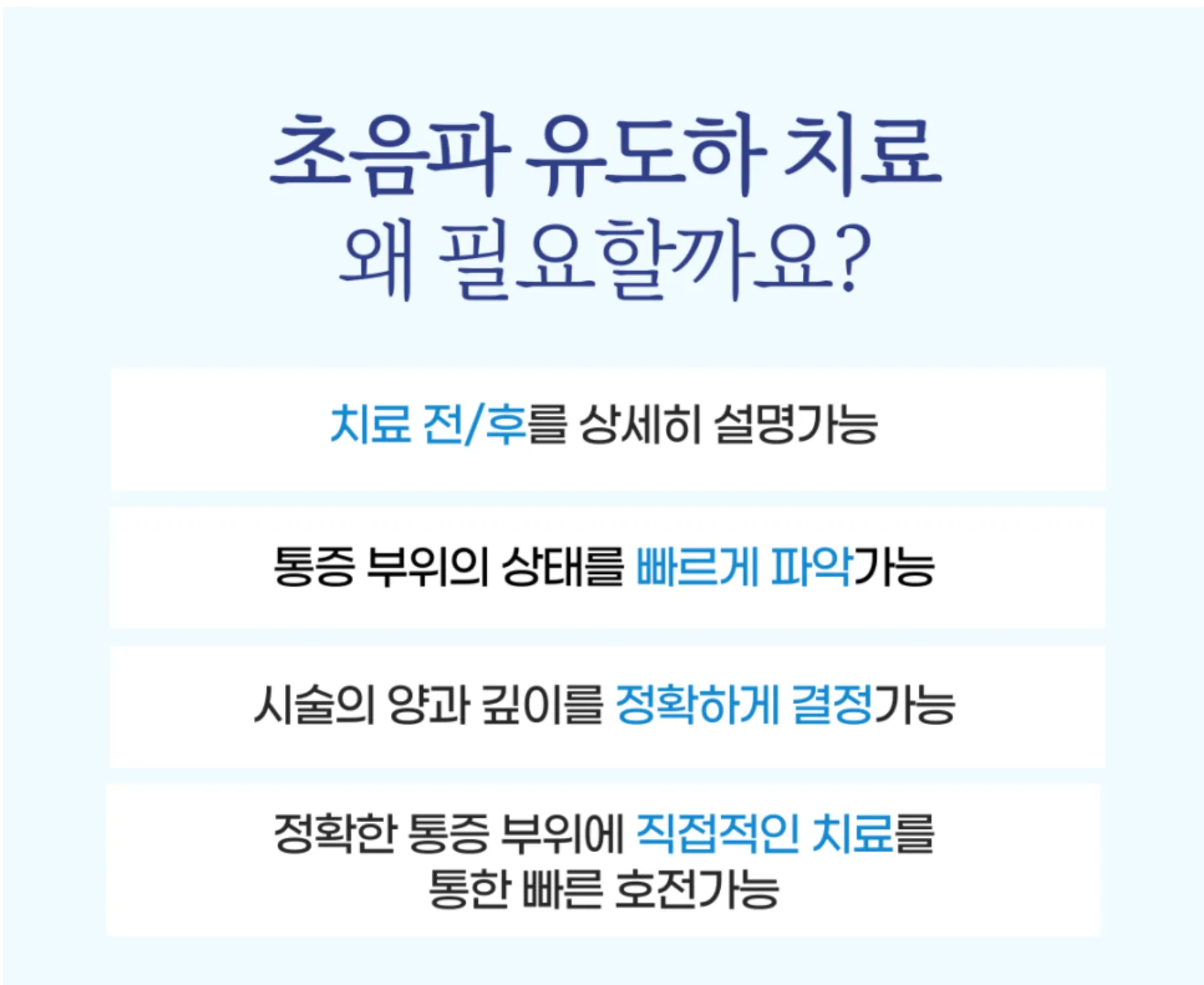 초음파 유도하 치료는 일단 초음파를 보면서 치료하니 실제로 아픈 부위를 정확히 찾아서 치료할 수 있습니다.